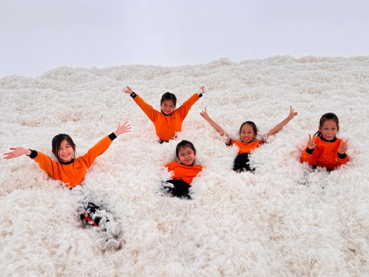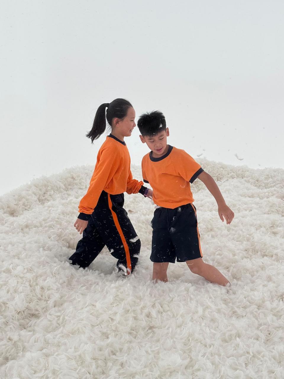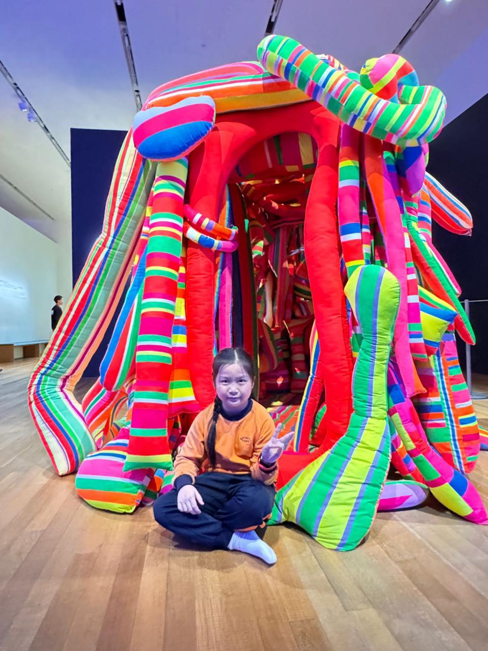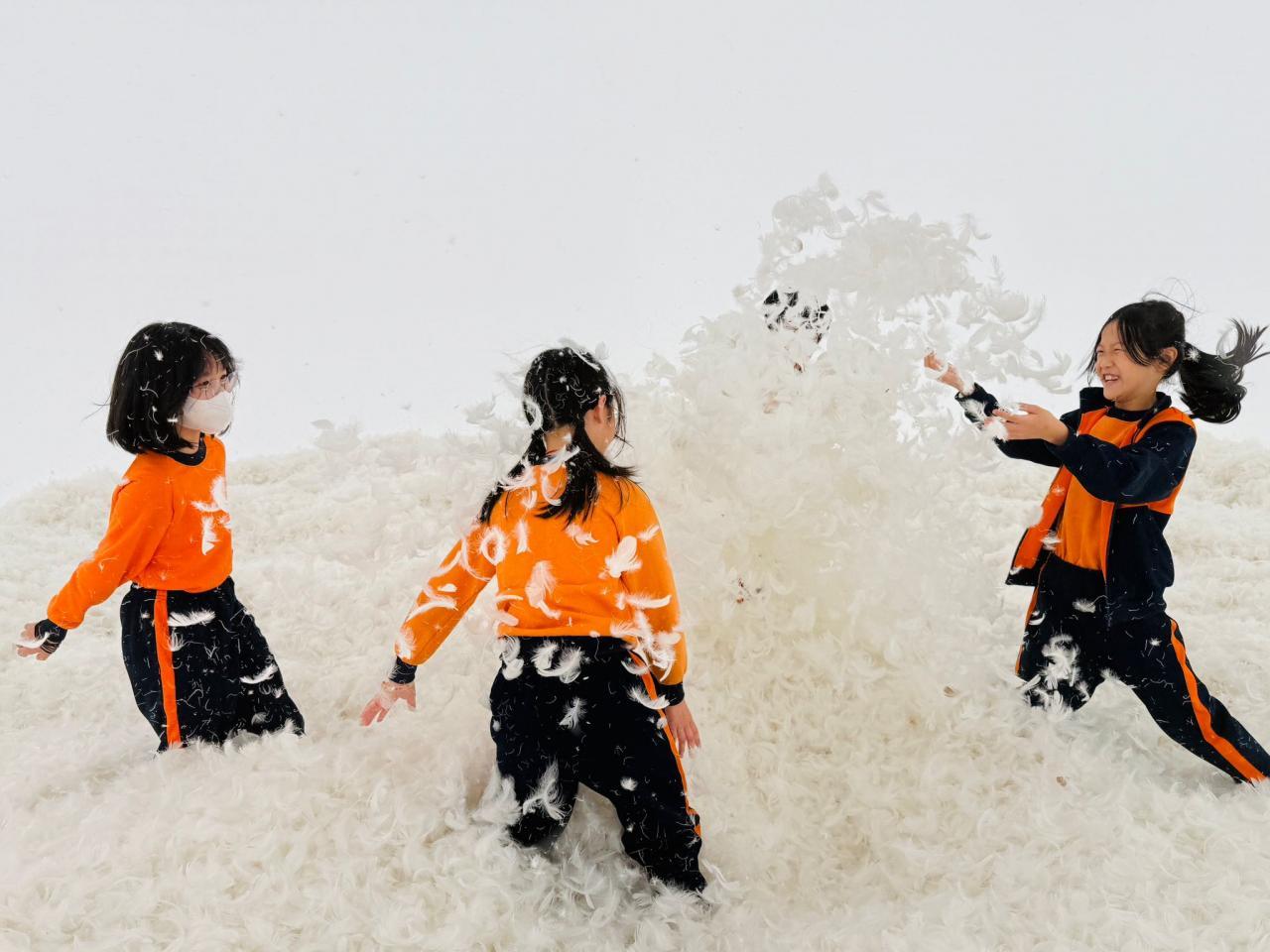 One of the highlights was an installation made of vividly colored cushions stacked to form an undulating mountain range. While appearing static, the installation invited interaction, with the artist expressing the idea that while the world may seem unchanging day by day, individuals have the power to make small yet meaningful changes. Another fascinating exhibit featured 300 pounds of pure white goose feathers collected from around the world. Students were invited to step into a completely white room and fully immerse themselves, becoming an integral element of the artwork.