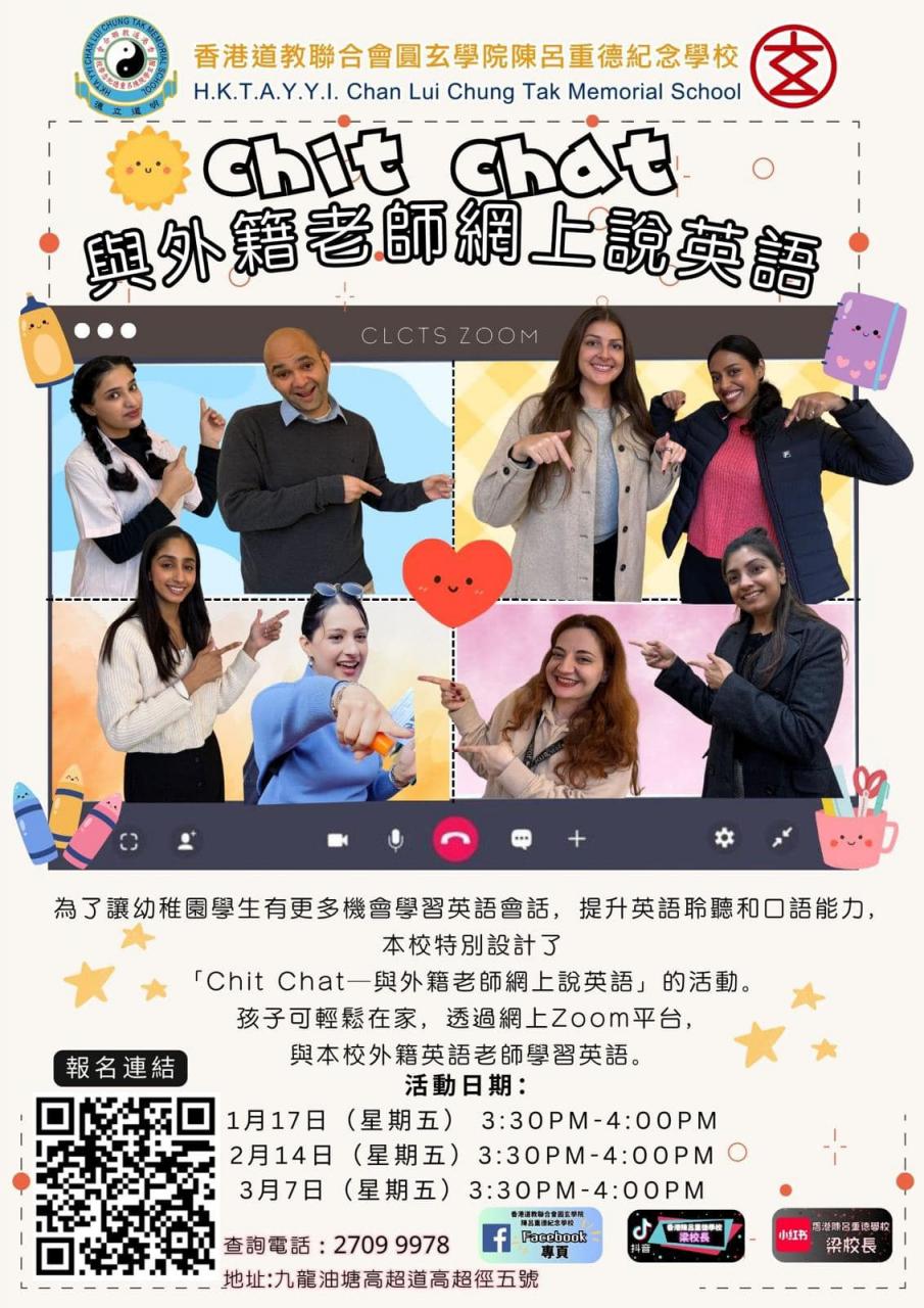 為了讓幼稚園學生有更多機會學習英語會話,提升英語聆聽和口語能力,本校特別設計了「Chit Chat─與外籍老師網上說英語」的活動。