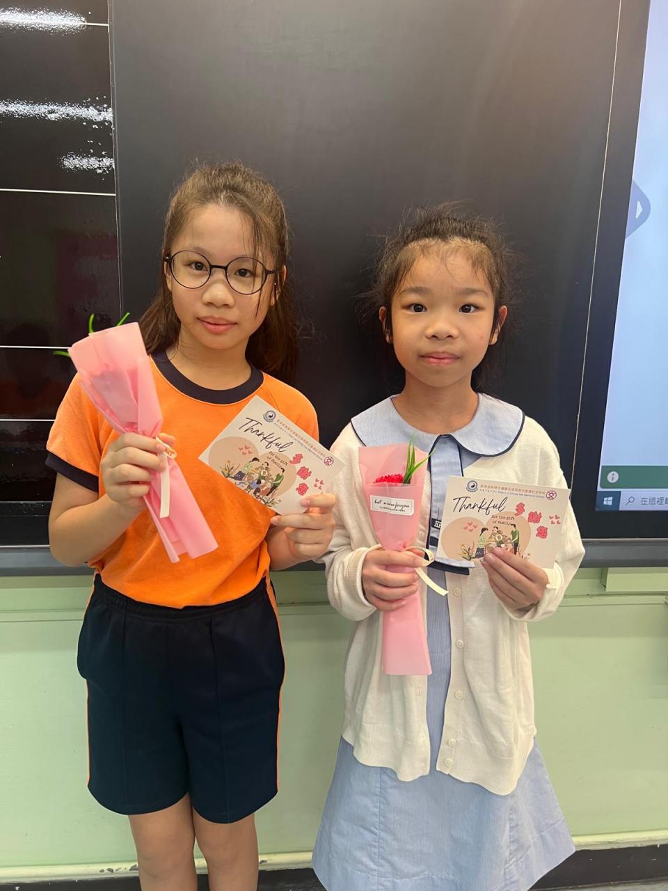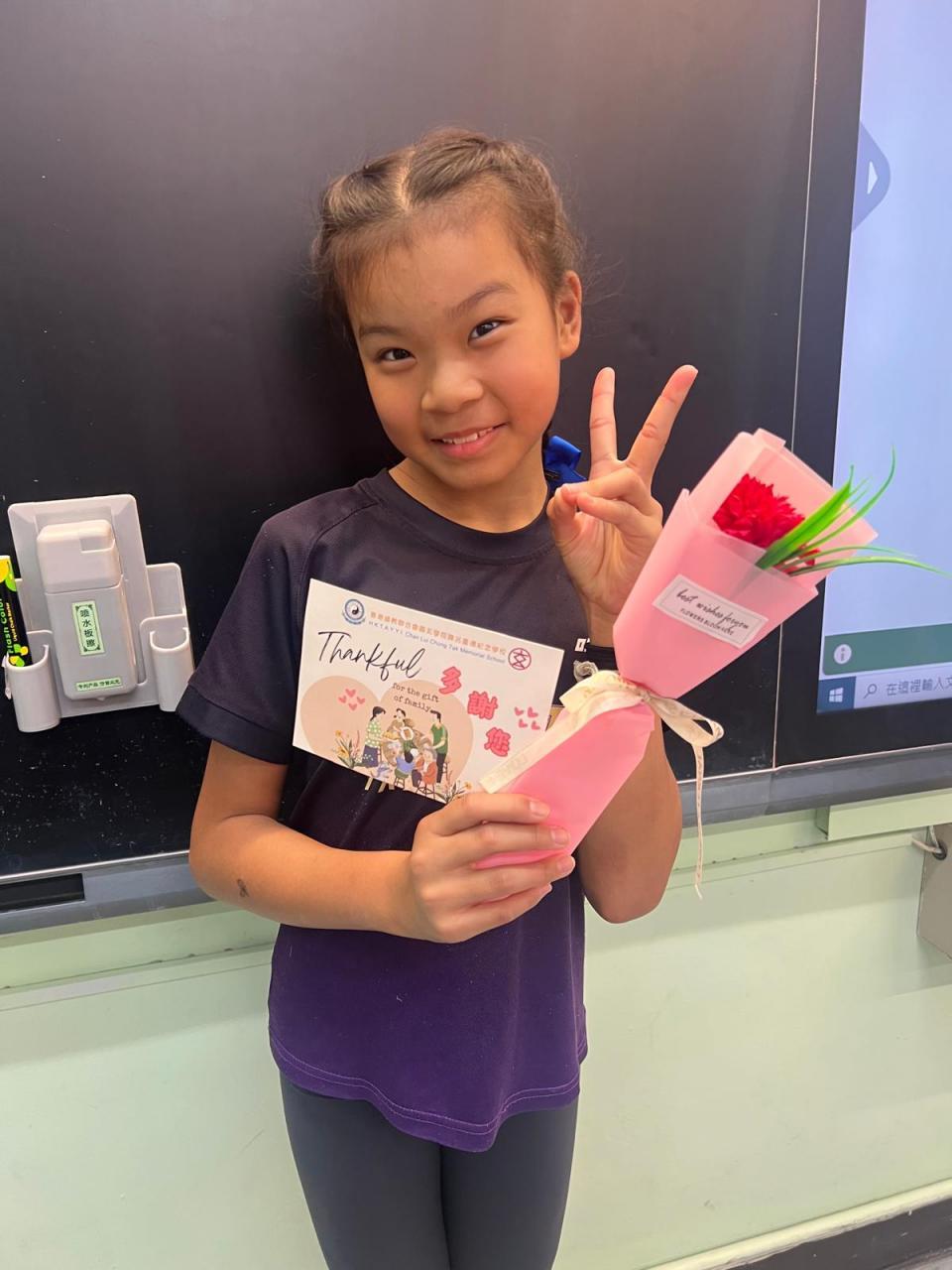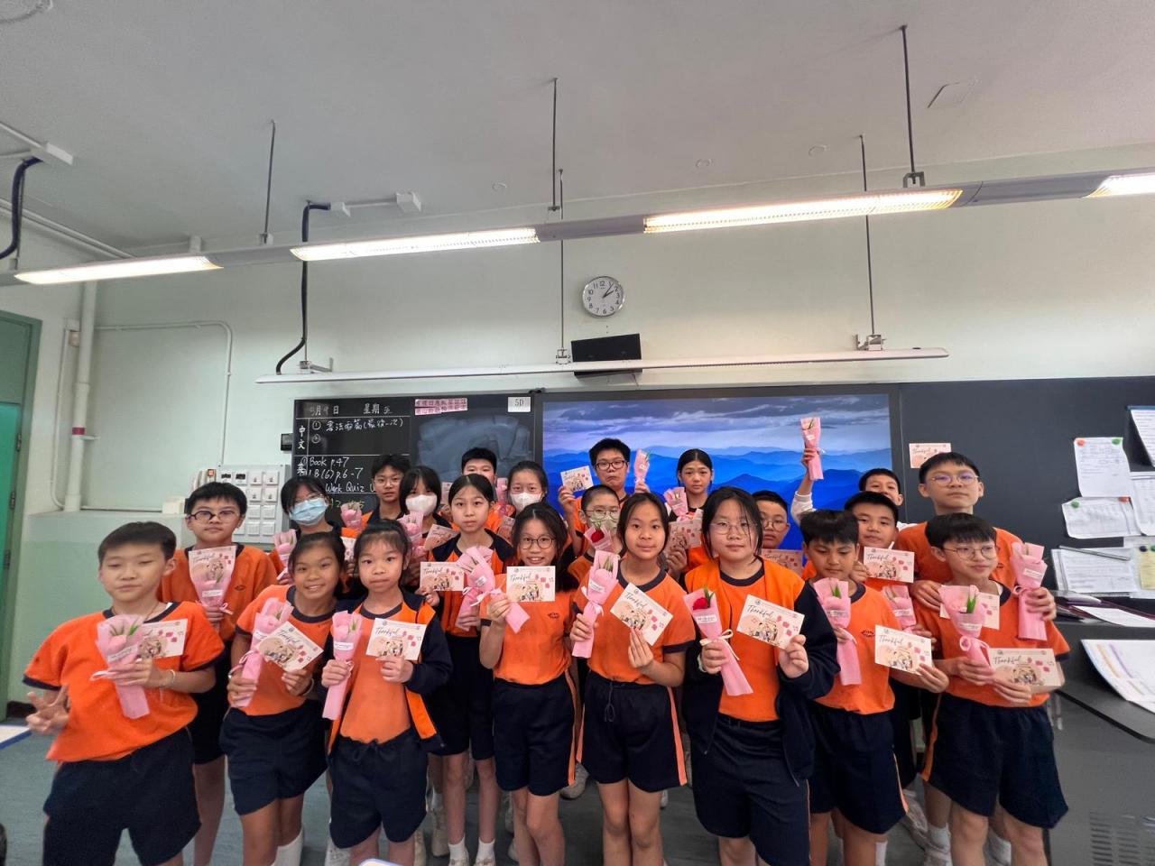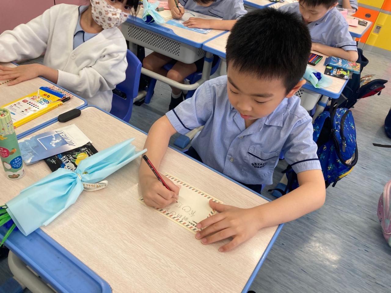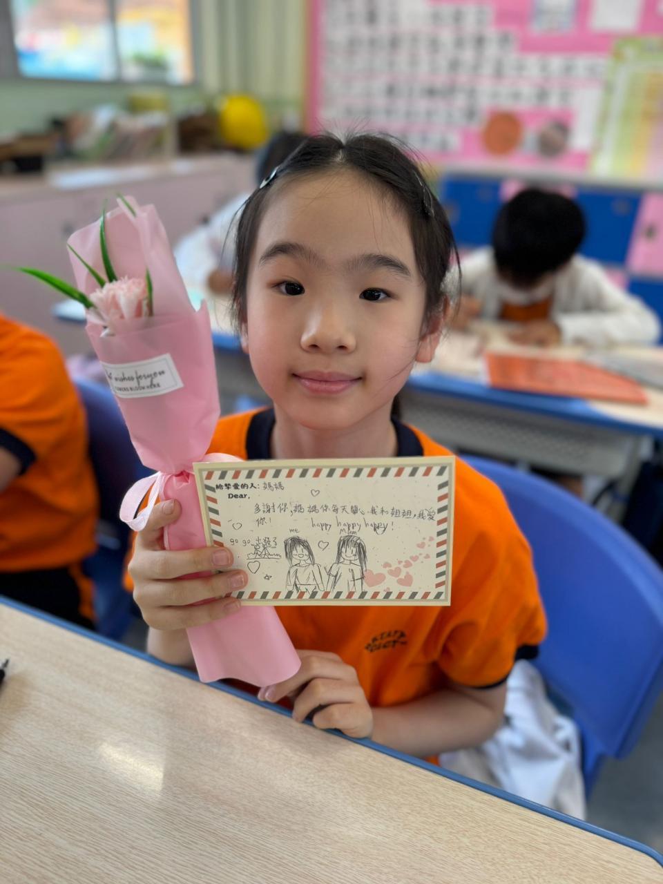 當天早上,梁校長、各位副校長和老師們在晨風中佇立校門前,迎接送孩子上學的家人和孩子,親手送上康乃馨,並和各位家長、孩子拍照留下溫馨的一刻。除了為每位家長準備了康乃馨,孩子更在導修課時在心意卡上寫上感謝的話語,以花和文字向家人傳遞感恩,每一張卡片都承載著獨一無二的心意。