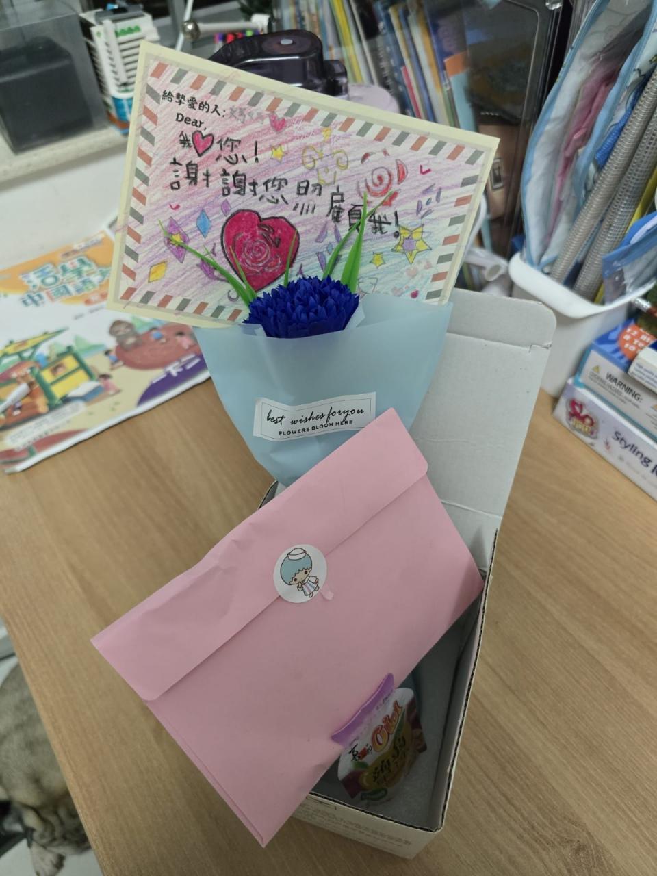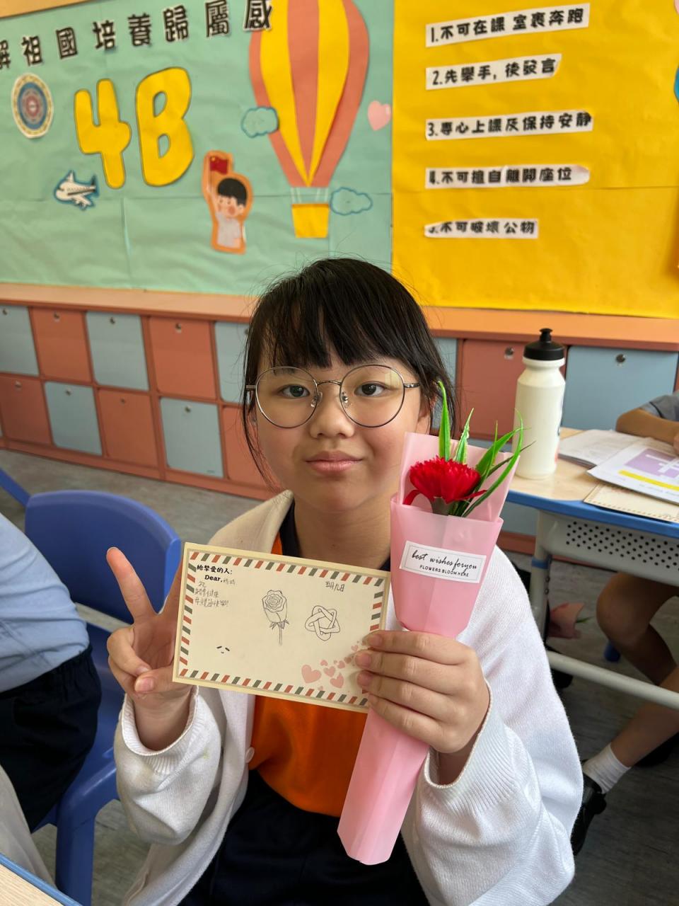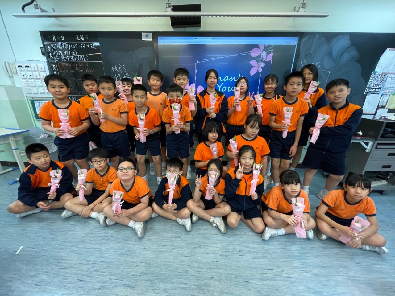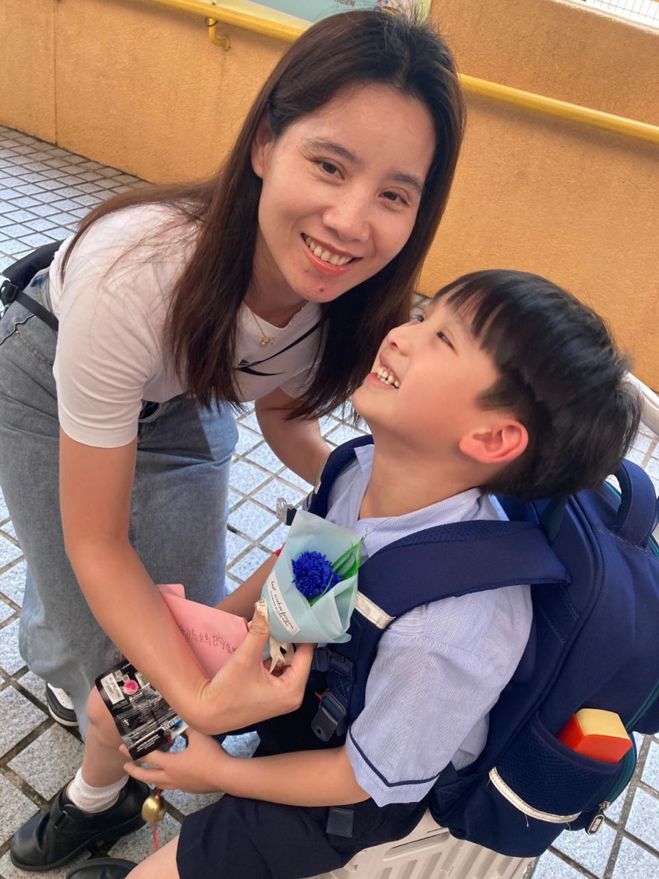 當天早上,梁校長、各位副校長和老師們在晨風中佇立校門前,迎接送孩子上學的家人和孩子,親手送上康乃馨,並和各位家長、孩子拍照留下溫馨的一刻。除了為每位家長準備了康乃馨,孩子更在導修課時在心意卡上寫上感謝的話語,以花和文字向家人傳遞感恩,每一張卡片都承載著獨一無二的心意。