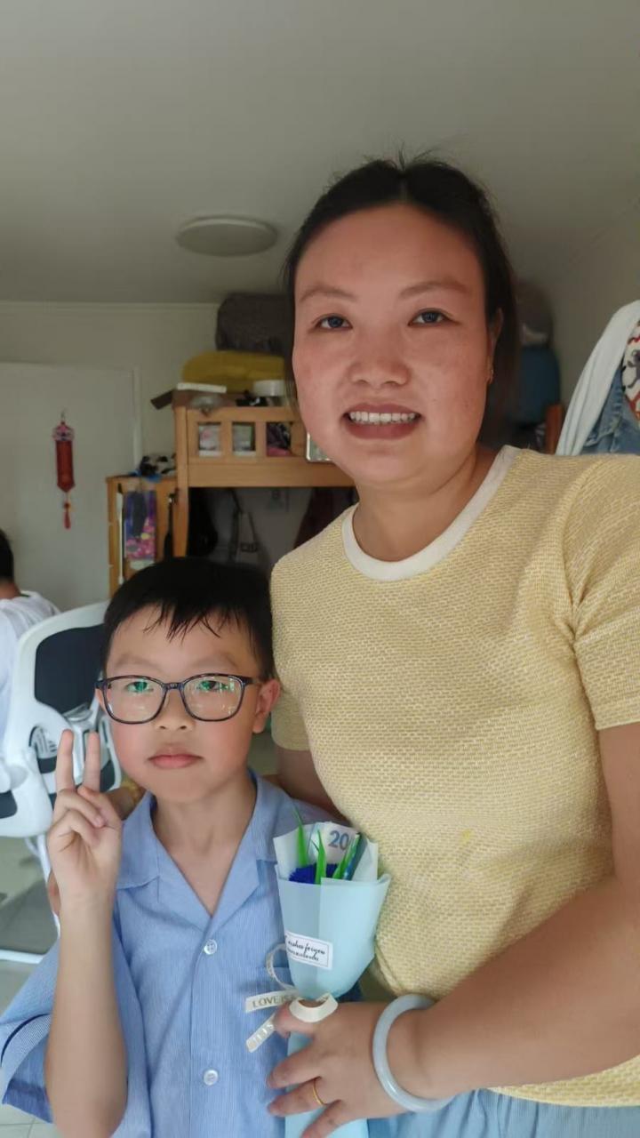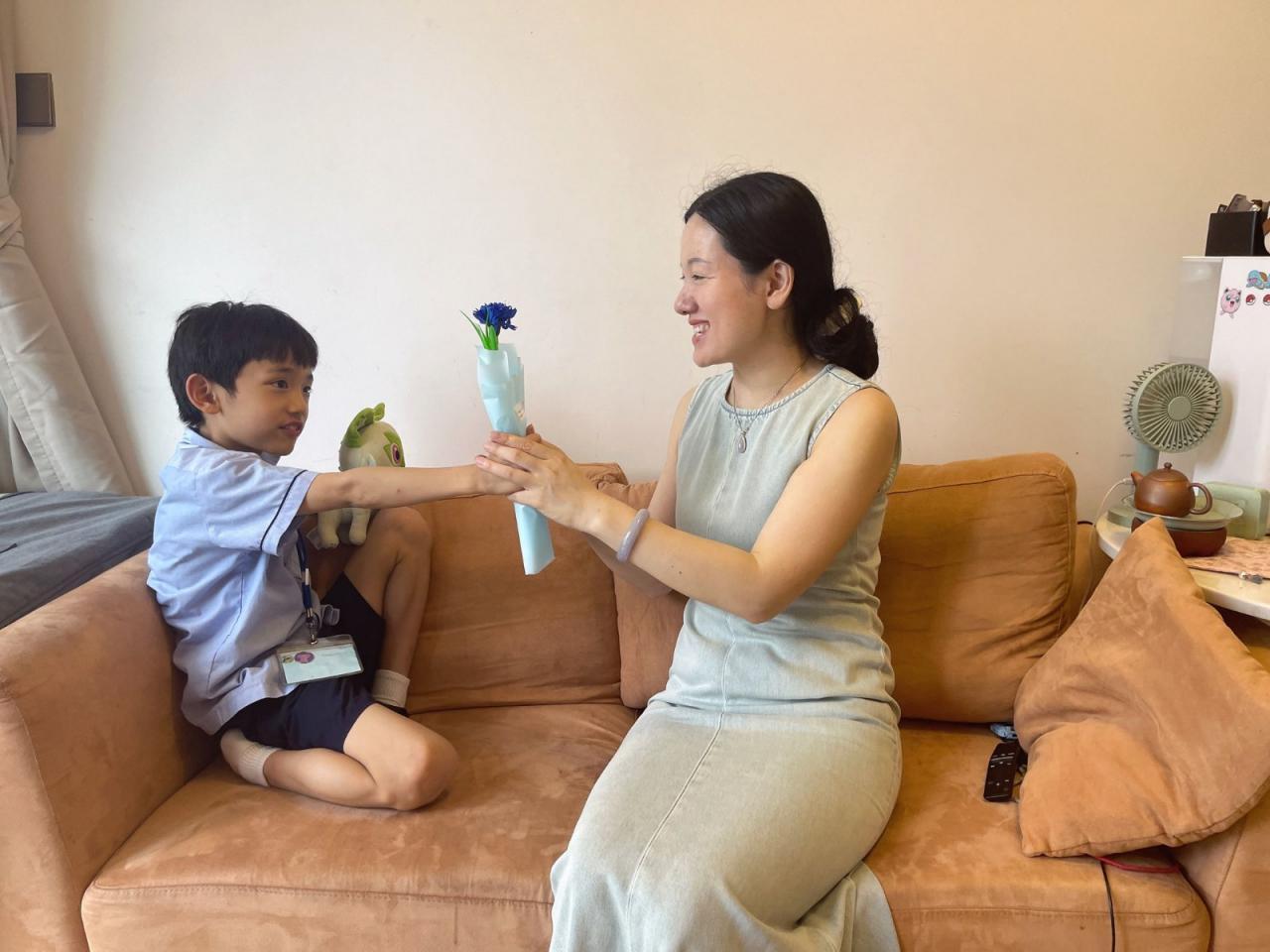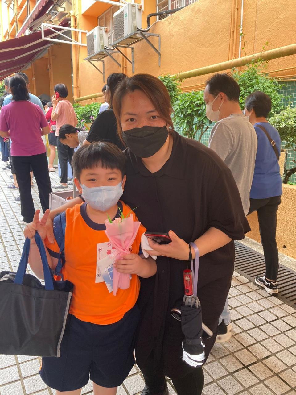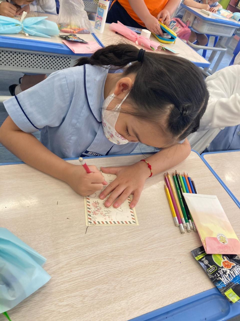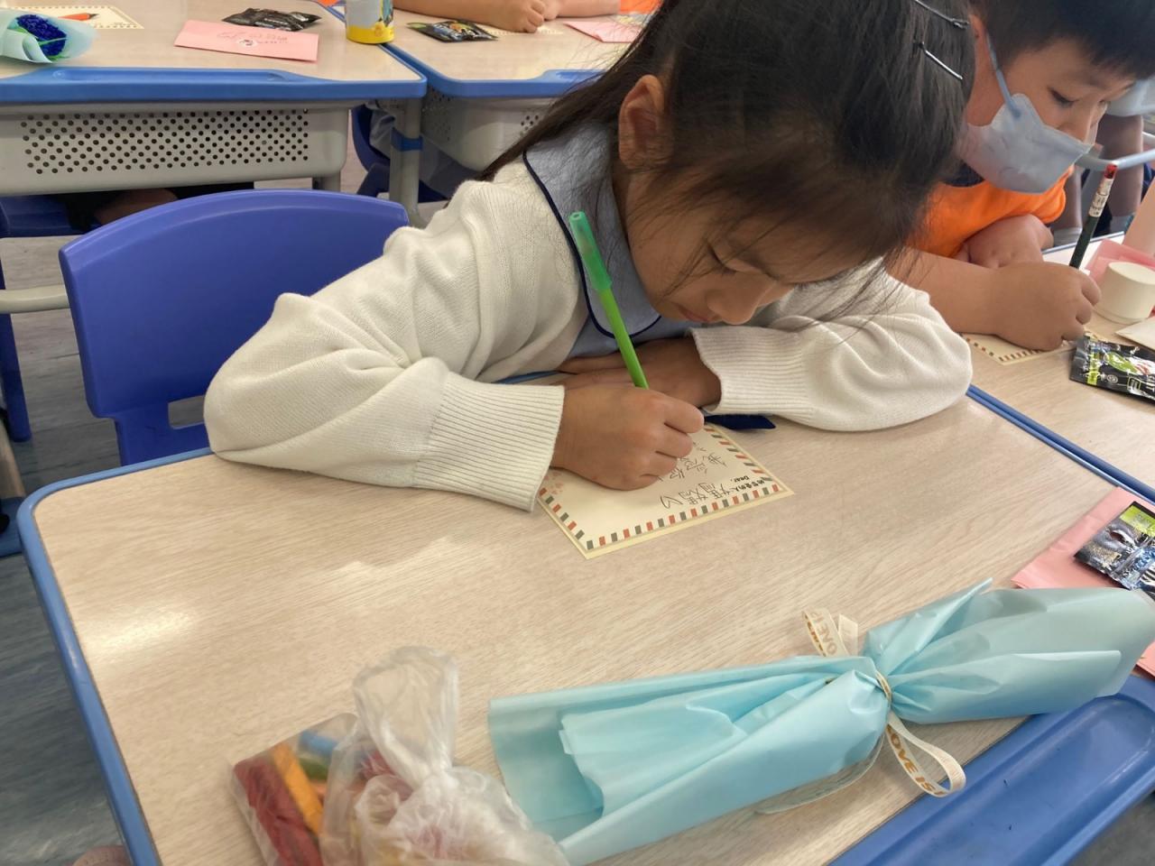 當天早上,梁校長、各位副校長和老師們在晨風中佇立校門前,迎接送孩子上學的家人和孩子,親手送上康乃馨,並和各位家長、孩子拍照留下溫馨的一刻。除了為每位家長準備了康乃馨,孩子更在導修課時在心意卡上寫上感謝的話語,以花和文字向家人傳遞感恩,每一張卡片都承載著獨一無二的心意。